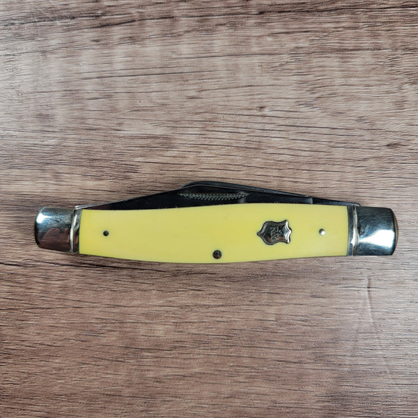 Rough Ryder brand with a synthetic yellow handle and stainless blades. Measures 4.25" closed.