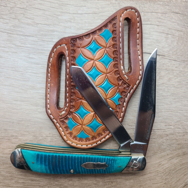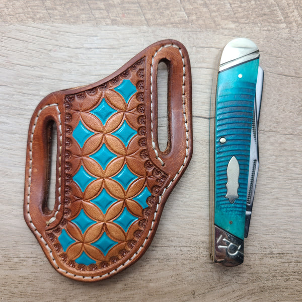 This is a pancake style leather knife sheath featuring a hand stamped and painted geometric design. The sheath is designed to be worn on the right side or on your back and is angled forward at 45 degrees. The sheath fits a 1 1/2" belt.